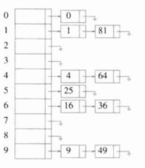 将散列到同一个值的所有元素保留在一个表中。为方便起见,这些表都有表头,如果空间很紧,更可取的方法是避免使用这些表头。(表长不用素数是为了简单起见,这里表长为10)